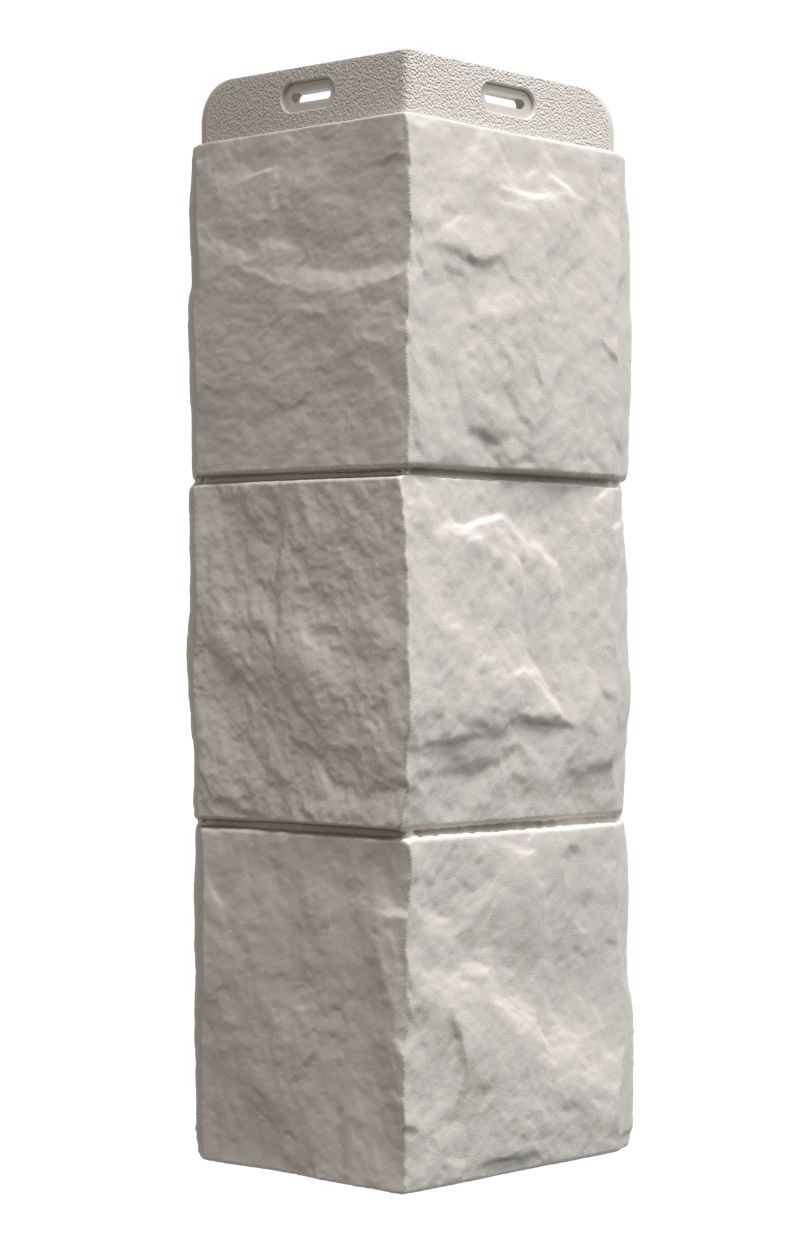Углы в цвете «перламутровый» — идеальное дополнение для фасадных панелей с эффектом крупноформатной каменной кладки. Спокойный многогранный цвет и швы в тон материала делают стык панели и угла практически незаметным.